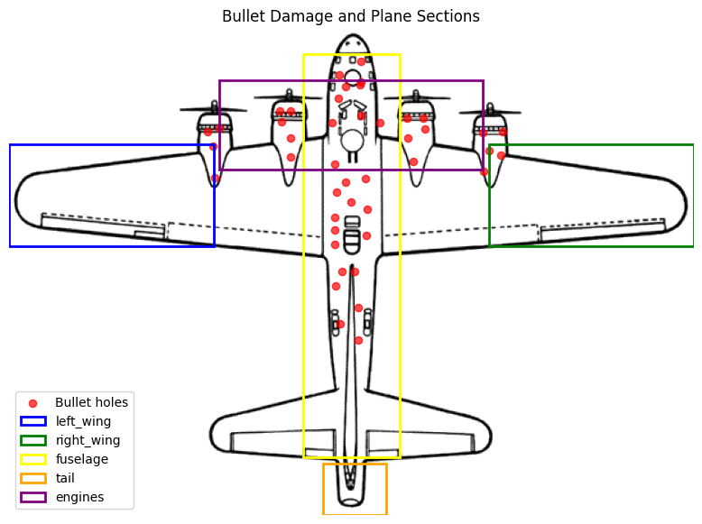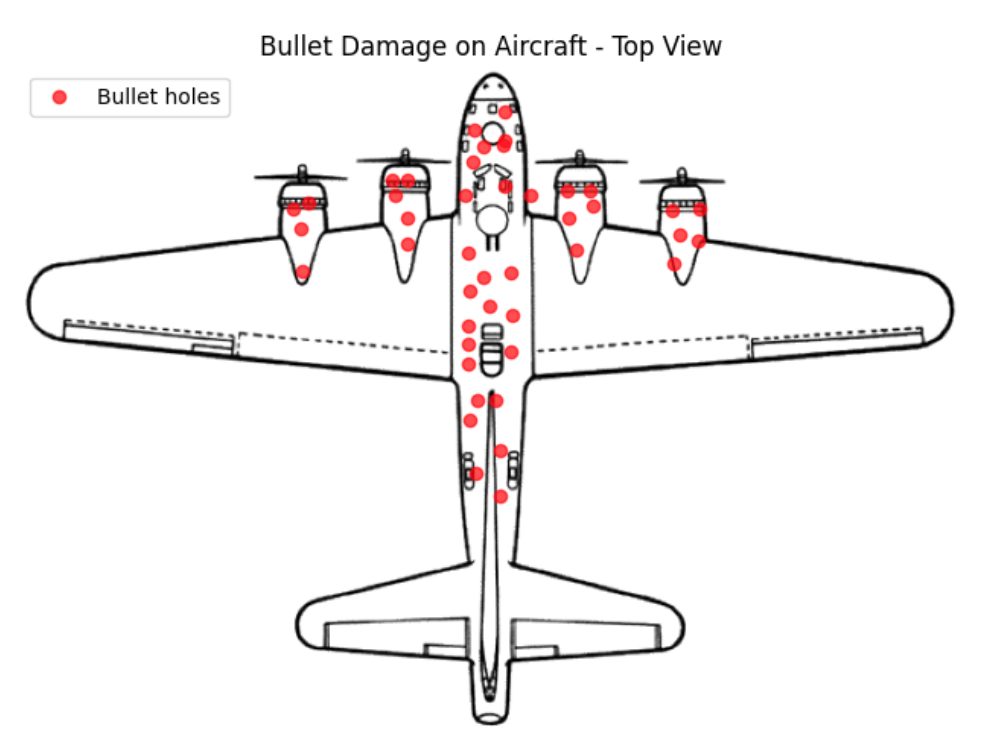 We were inspired by the work of Abraham Wald during WWII. Wald applied statistical insights, notably the concept of survivorship bias, to recommend that aircraft be armored not where bullet holes were most common, but in areas that showed little damage. His reasoning was that planes returning with bullet holes had survived, so the untouched areas were more vulnerable. While Wald’s original data showed damage around the wings, our scenario focuses on damage centered on the engines.