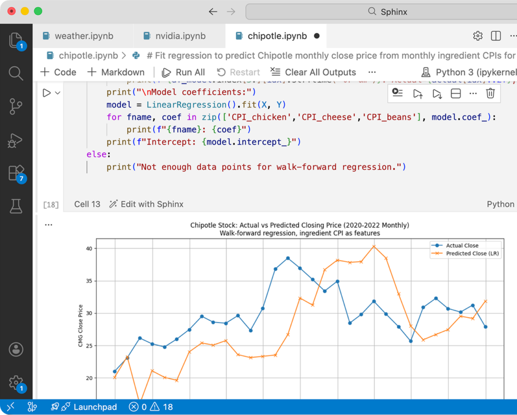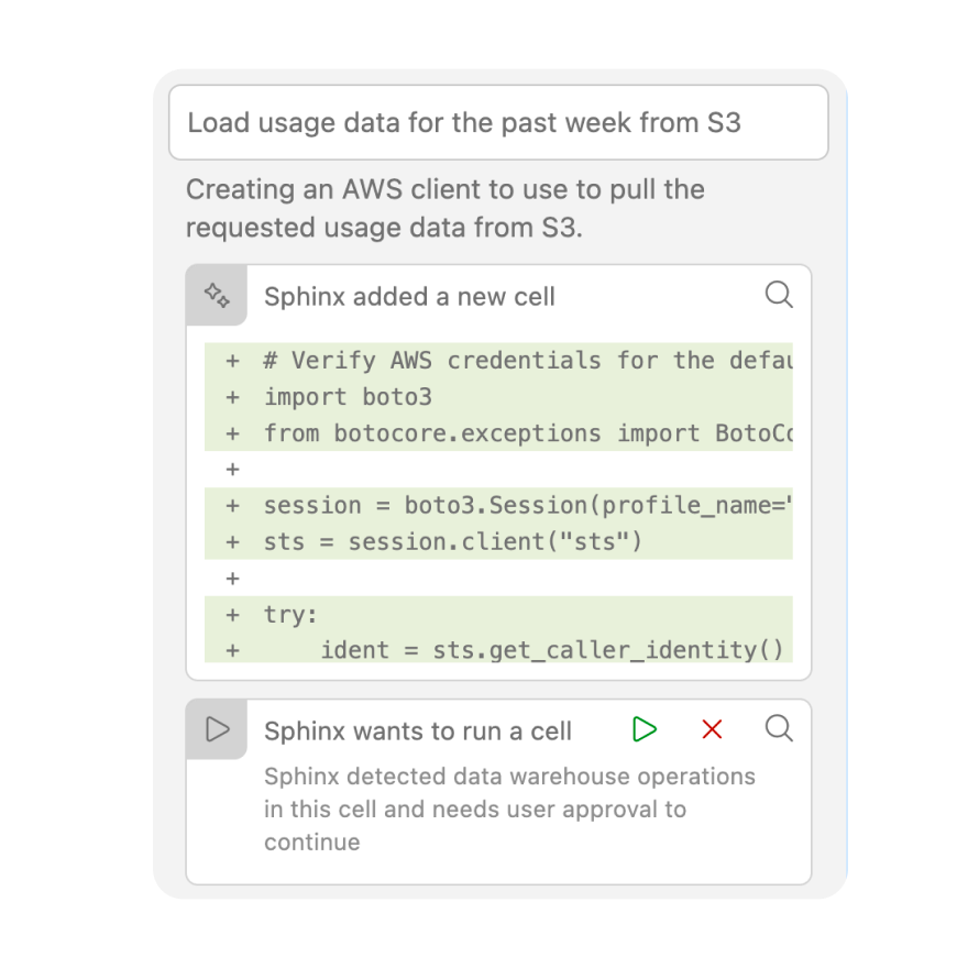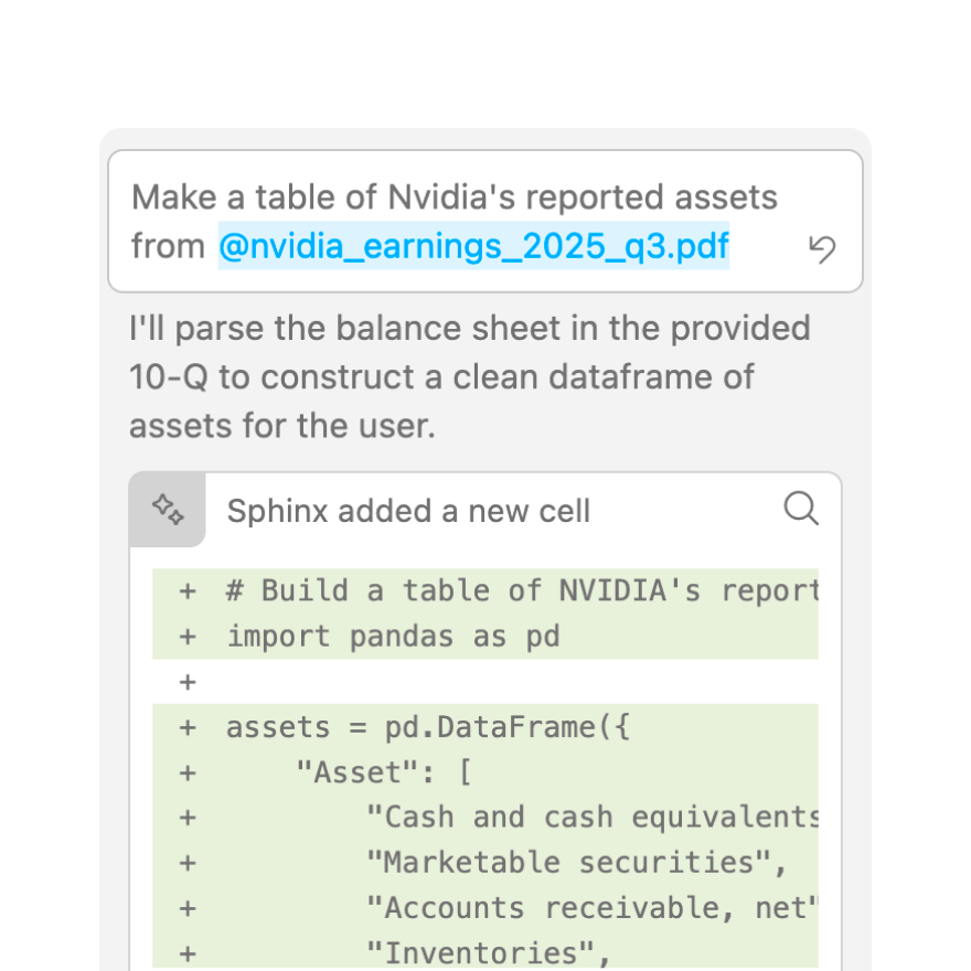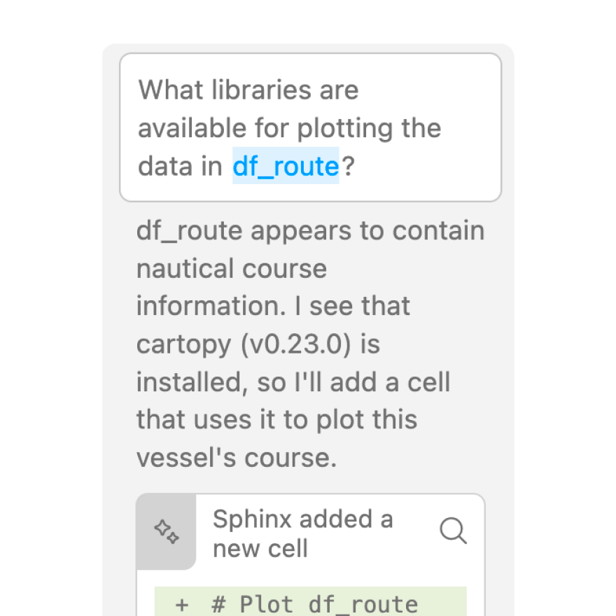Sphinx is natively designed to work with Jupyter notebooks, and is given extensive context on defined variables, dataframes, and imports.