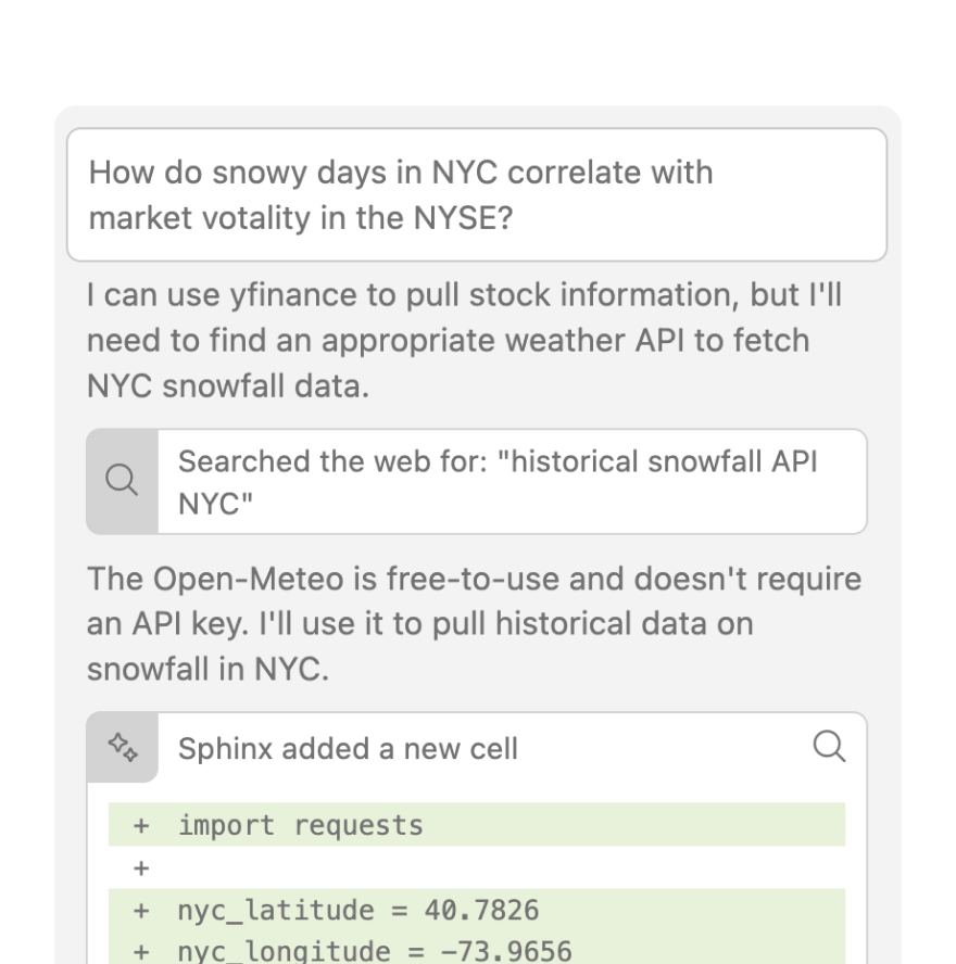 Sphinx automatically searches the internet for public datasets and APIs that it can use in performing analyses.
